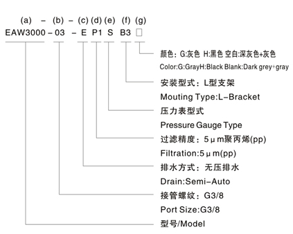 | EAW1000 | 01 | G1/8 | 空白 | 手动排水 | P1 | 5μm聚丙烯(pp) | 空白 | 无压力表 | 空白 | 不带支架 | 空白 | 深灰色+灰色 |