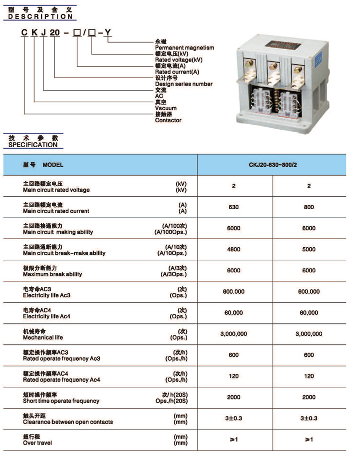 CKJ20-800/2,沪远,HY,CKJ20系列交流真空接触器