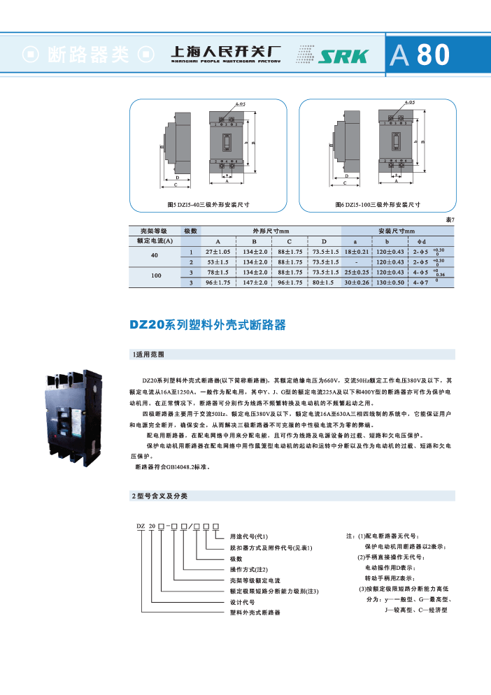 适用于交流50Hz,额定工作电压400V及以下,额定电流16-1250A。一般作为配电用,其中额定电流100A断路器亦可作为保护电动机之用。在正常情况下,断路器可分别作为线路的不频繁转换起动之用。执行GB14048.2标准